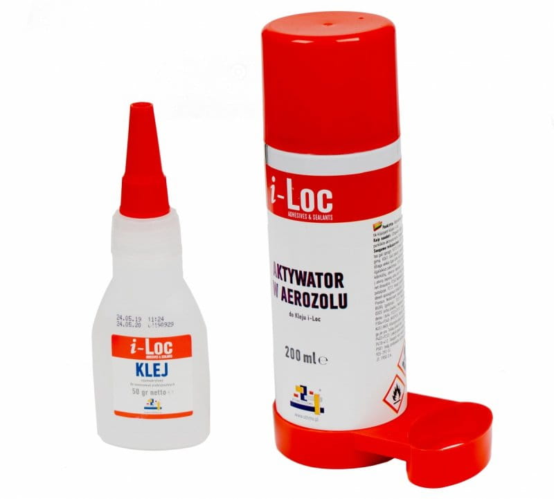 W naszej hurtowni internetowej mogą się Państwo zaopatrzyć w klej i-LOC, który jest odporny na działanie wilgoci. Połączenie ze sobą wybranych elementów następuje tu po około 10 sekund, a 100% odporność łączenia na naprężenia - po mniej więcej 2 minutach. W skład zestawu, poza klejem cyjanoakrylowym o pojemności 50 g wchodzi również aktywator w aerozolu, którego pojemność wynosi 200 ml.