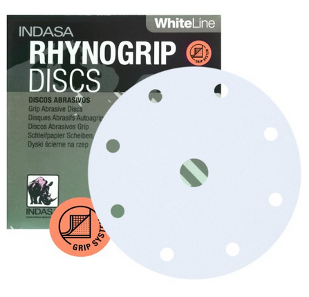 Krążki ścierne na rzep INDASA Rhynogrip White Line o średnicy 150 mm 9H przeznaczone są zarówno do szlifierek mimośrodowych, orbitalnych, kątowych jak i do szlifowania ręcznego na sucho.