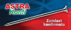 Wkręt dostępny z gniazdem krzyżowym Pz 2 lub z gniazdem Tx 20 w ocynku białym. Siła utrzymania wkręta w płycie wiórowej porównywalna z siłą utrzymania wkręta typu KONFIRMAT (ta sama powierzchnia gwintu). Cena wkrętów ASTRA KONFI również porównywalna do cen KONFIRMAT-a.