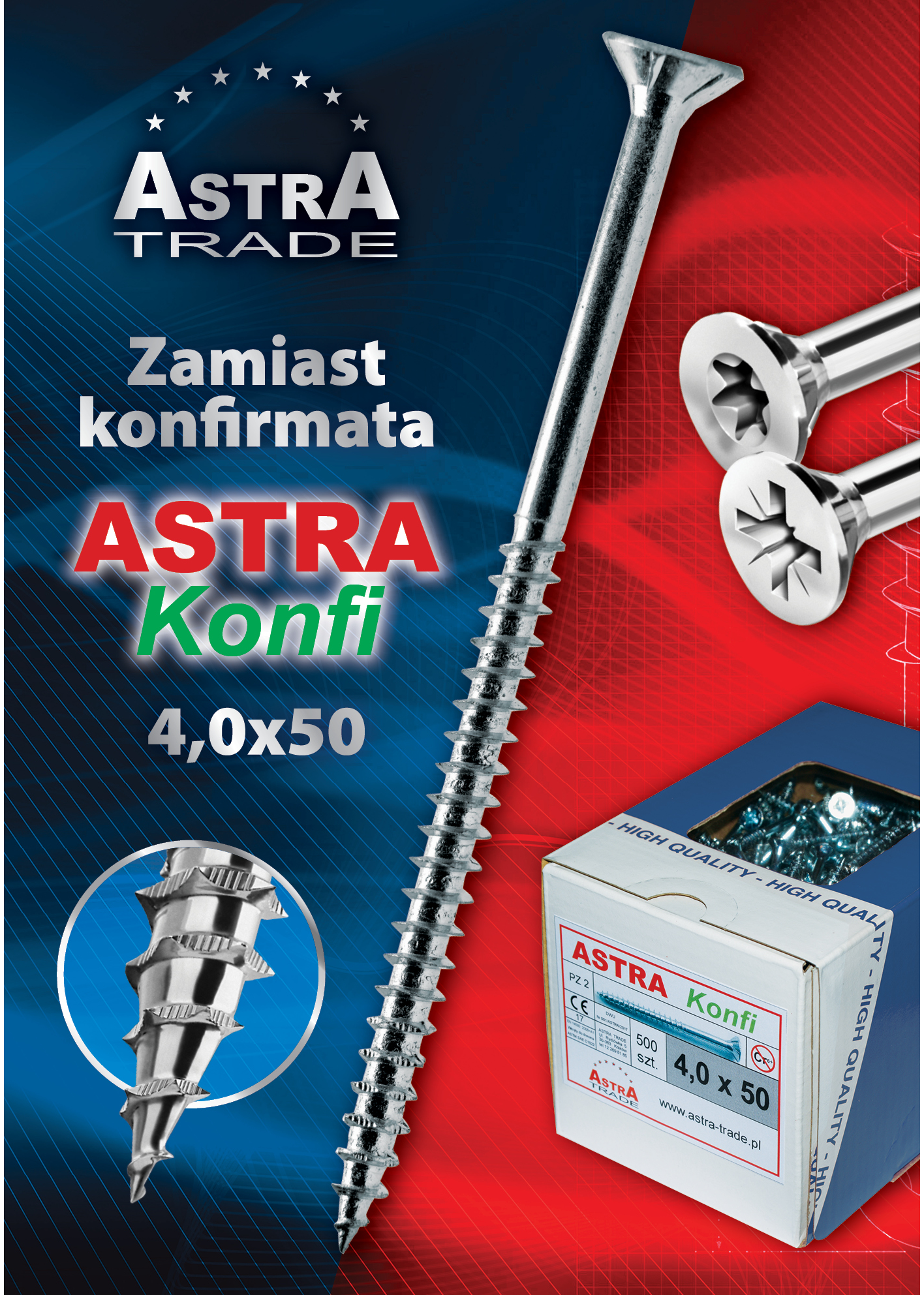 Wkręt dostępny z gniazdem krzyżowym Pz 2 lub z gniazdem Tx 20 w ocynku białym. Siła utrzymania wkręta w płycie wiórowej porównywalna z siłą utrzymania wkręta typu KONFIRMAT (ta sama powierzchnia gwintu). Cena wkrętów ASTRA KONFI również porównywalna do cen KONFIRMAT-a.