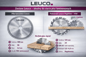 Kompletny zestaw narzędzi marki LEUCO przeznaczony do precyzyjnego rozkroju płyt laminowanych, MDF oraz płyt wiórowych. Połączenie piły głównej 300x30 mm Z96 z podcinakiem LEUCO Highline HW 125 mm Z24 gwarantuje idealnie czyste krawędzie – bez wyszczerbień i odprysków po obu stronach materiału.